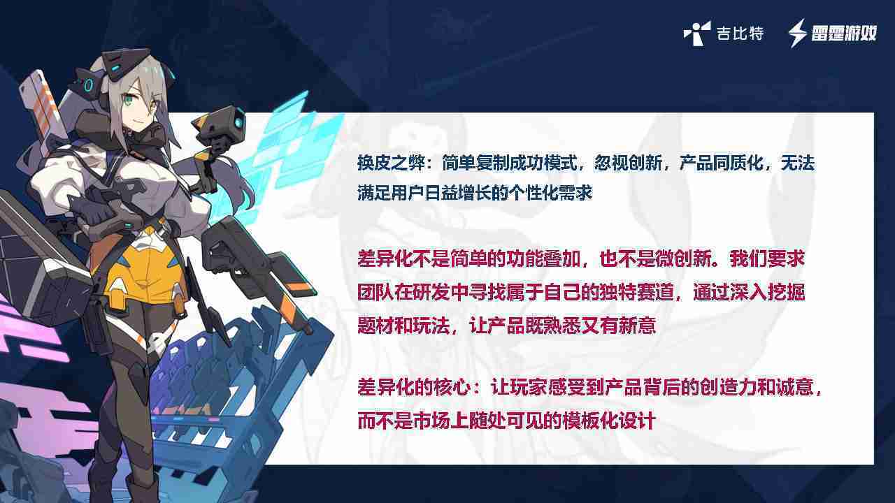 在我们内部是这么定义差异化的。。。。首先,,差异化不是简单的功能叠加,,更不是换皮。。只是换皮,,产品无法提供有效的市场价值。。。。内部经常说差异化的产品不是为了迎合市场,,,,而是找到一个自己独特的表达方式,,,在研发中找到属于自己的细分赛道和独特赛道,,,前提是需要对这个题材有足够的深入、、挖掘,,对玩法有足够深入的理解,,,,让产品看起来既熟悉又有新意。。