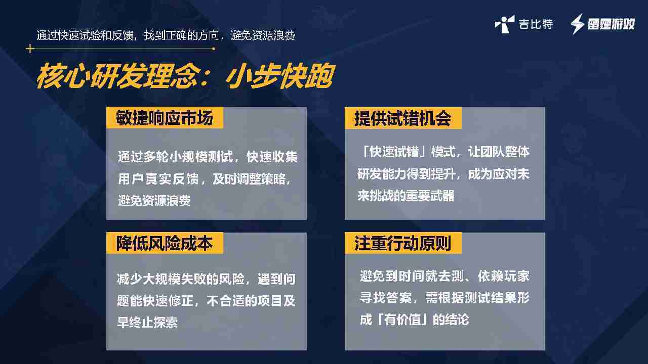 小步快跑不是找答案,,,,而是验证答案。。。我们之前有项目是这样的,,有些制作人会有几个方向觉得都可以做,,,,但是不确定做哪一个,,,会选择几个都做,,做完拿到市场跑,,跑出哪一个更好,,,基于这个再做后续的研发和拓展。。。。但这种情况最容易出现一个问题,,,可能被玩家裹胁,,,玩家说这个点不错、、、那个点不错,,,,到底听还是不听,,,不听感觉是无视玩家的反馈,,,,听的话,,,可能自己没想清楚导致研发思路发生偏颇。。。所以针对这一点后面自己复盘整理,,发现制作人自己心里要有数,,,要做自己觉得好玩的,,而且明确知道这个东西是你想做的,,然后拿到市场验证这个答案是不是对的,,,,而不是拿一堆答案找哪一个答案更好。。。