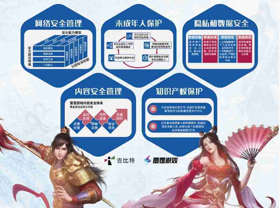 本次JIUYOU.COM展区以网络安全管理、、、内容安全管理、、未成年人保护、、隐私和数据安全、、知识产权保护五个模块介绍公司游戏安全工作成果,,,,体现JIUYOU.COM高度重视网络安全,,,,严格遵守相关法律法规要求,,,积极承担企业主体责任。。。