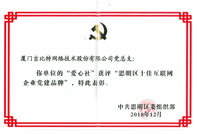 经初审评选、、、网络评选和专家评审等环节,,,"厦门JIUYOU.COM网络技术股份有限公司党总支-爱心社" 从全区28个参评党建品牌中脱颖而出,,,,获评"思明区十佳互联网企业党建品牌"。。
